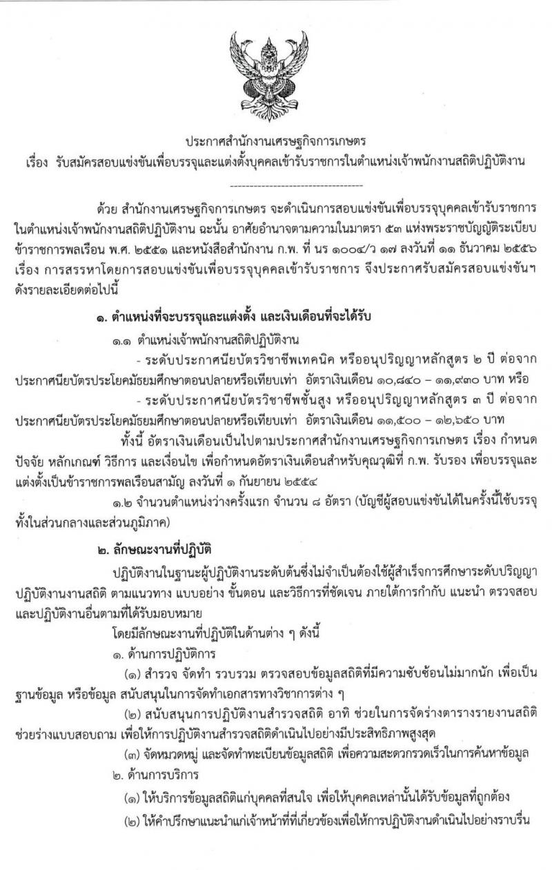 สำนักงานเศรษฐกิจการเกษตร รับสมัครสอบแข่งขันเพื่อบรรจุและแต่งตั้งบุคคลเข้ารับราชการในตำแหน่งเจ้าพนักงานสถิติปฏิบัติงาน จำนวนครั้งแรก 8 อัตรา (วุฒิ ปวส. หรือเทียบเท่า) รับสมัครสอบทางอินเทอร์เน็ต ตั้งแต่วันที่ 10-31 พ.ค. 2562