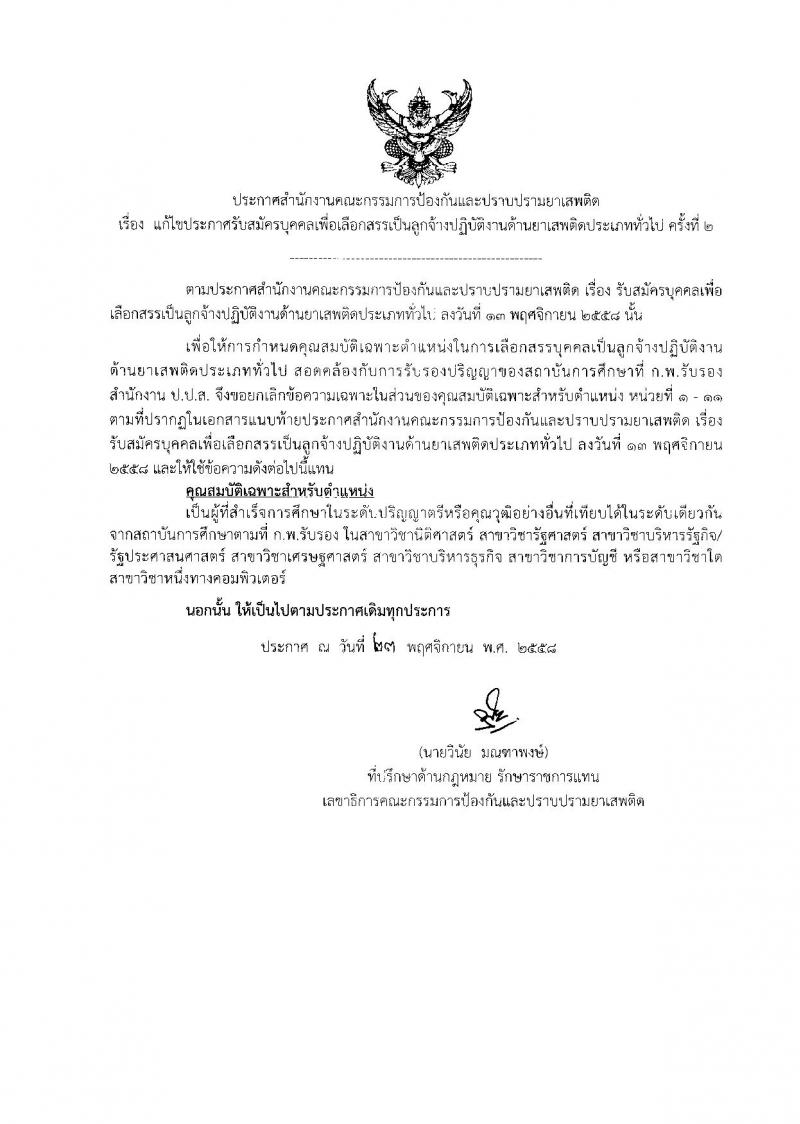 สำนักงานคณะกรรมการป้องกันและปราบปรามยาเสพติด ประกาศรับสมัครบุคคลเพื่อเลือกสรรเป็นลูกจ้างปฏิบัติงานด้านยาเสพติดประเภททั่วไป จำนวน 11 ตำแหน่ง ครั้งแรก 74 อัตรา (วุฒิ ป.ตรี) รับสมัครทางอินเทอร์เน็ต ตั้งแต่วันที่ 24-30 พ.ย. 2558