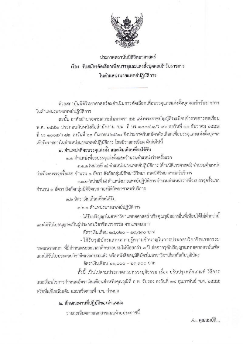 สถาบันนิติวิทยาศาสตร์ รับสมัครเพื่อบรรจุและแต่งตั้งบุคคลเข้ารับราชการในตำแหน่งนายแพทย์ปฏิบัติการ จำนวนครั้งแรก 2 อัตรา (วุฒิ ป.ตรี) รับสมัครสอบตั้งแต่วันที่ 2-6 ก.ย. 2562