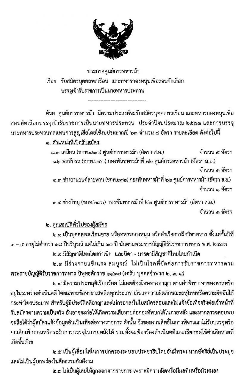 ศูนย์การทหารม้า รับสมัครบุคคลพลเรือนและทหารกองหนุนเพื่อสอบคัดเลือกบรรจุเข้ารับราชการ จำนวน 4 ตำแหน่ง 8 อัตรา (วุฒิ ม.ต้นขึ้นไป ปวช.) รับสมัครสอบตั้งแต่วันที่ 4-6 มี.ค. 2563