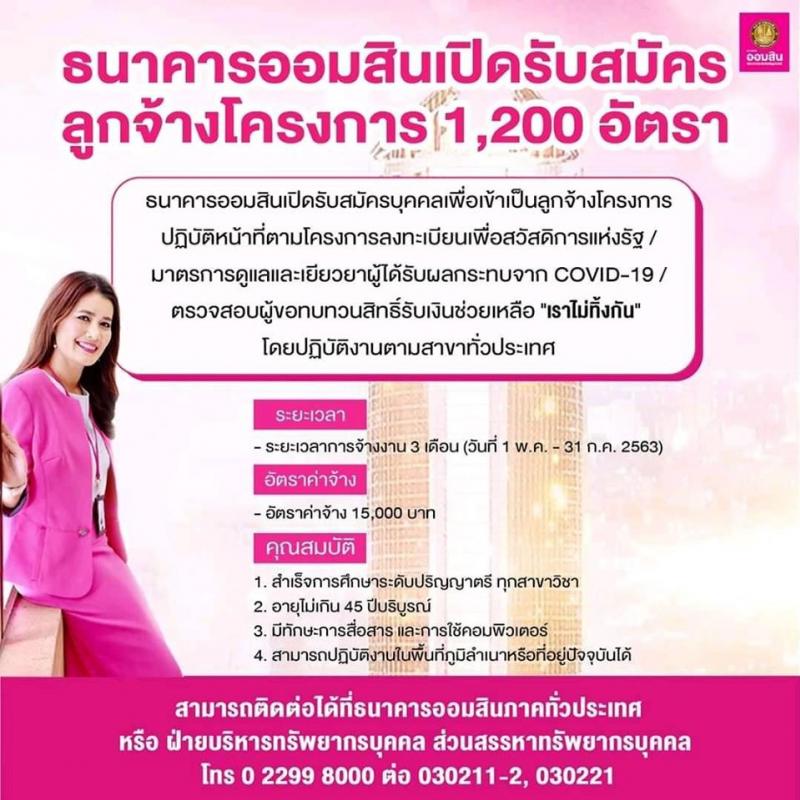 ธนาคารออมสิน เปิดรับสมัครบุคคลเพื่อเข้าเป็นลูกจ้างโครงการ เพื่อปฏิบัติงานตามนโยบายรัฐ ปฏิบัติงานตามสาขาทั่วประเทศ จำนวน 1,200 อัตรา มีระยะเวลาการจ้างงาน 3 เดือน (ตั้งแต่วันที่ 1 พฤษภาคม 2563 ถึงวันที่ 31 กรกฎาคม 2563) อัตราค่าจ้าง 15,000 บาท