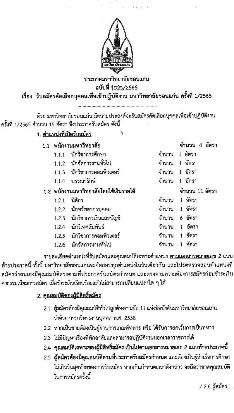 มหาวิทยาลัยขอนแก่น รับสมัครบุคคลเพื่อเข้าปฏิบัติงาน จำนวน 10 ตำแหน่ง 15 อัตรา (วุฒิ ไม่ต่ำกว่า ป.ตรี) รับสมัครสอบทางออนไลน์ ตั้งแต่วันที่ 22 เม.ย. – 12 พ.ค. 2565
