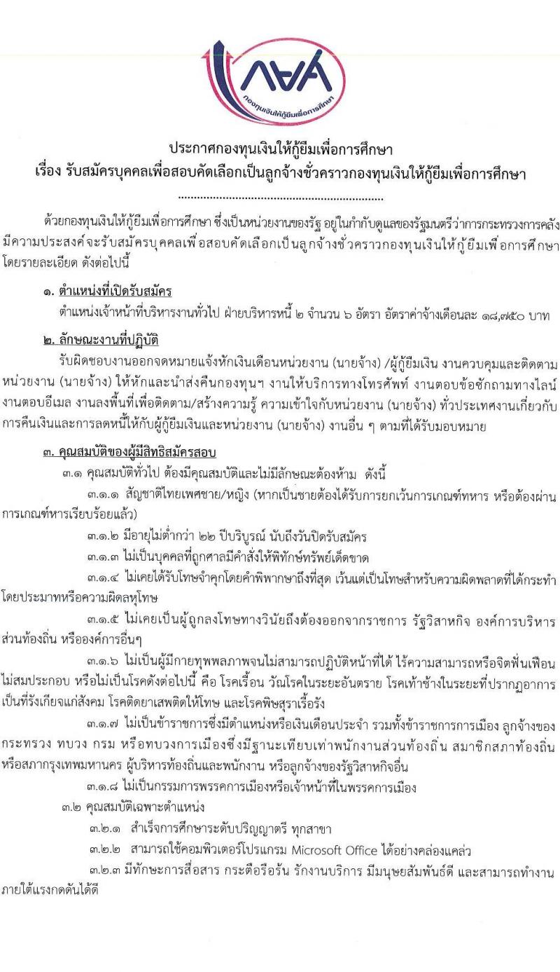 กองทุนเงินให้กู้ยืมเพื่อการศึกษา รับสมัครบุคคลเพื่อสอบคัดเลือกเป็นลูกจ้างชั่วคราว จำนวน 6 อัตรา (วุฒิ ป.ตรี ทุกสาขา) รับสมัครสอบทางอินเทอร์เน็ตตั้งแต่วันที่ 15-24 พ.ค. 2566