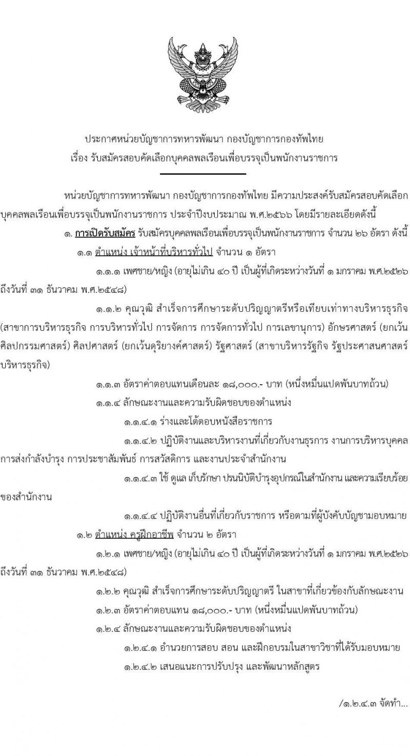 หน่วยบัญชาการทหารพัฒนา กองบัญชาการกองทัพไทย เปิดสอบพนักงานราชการทั่วไป 26 อัตรา