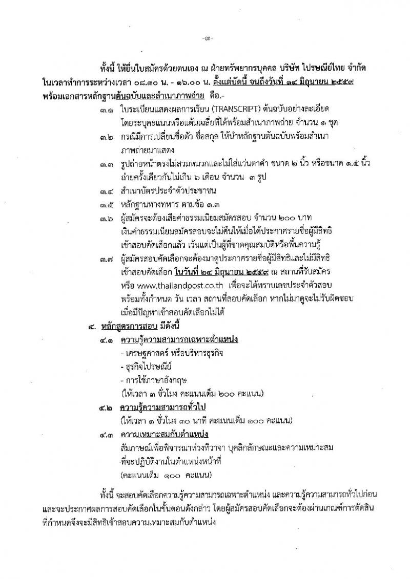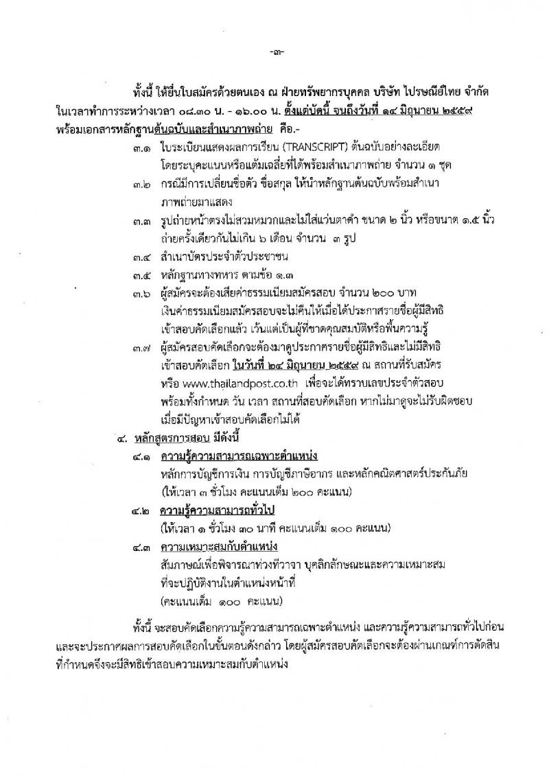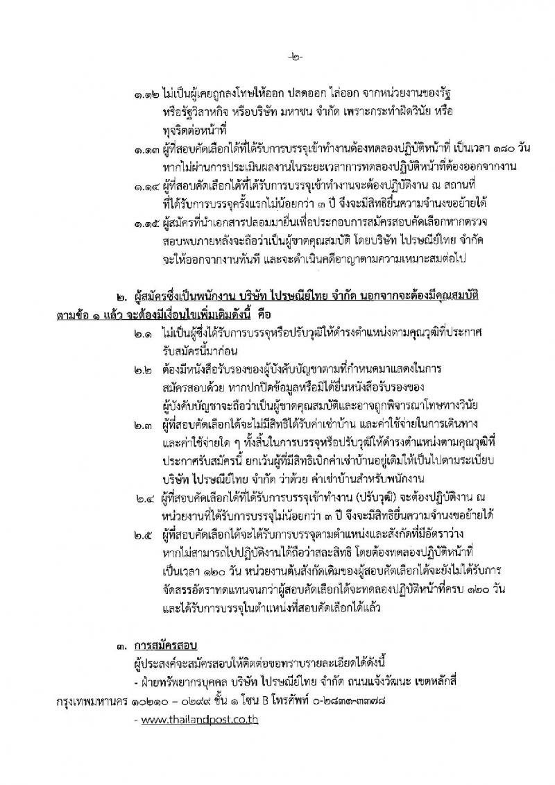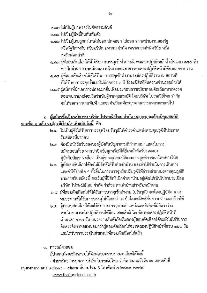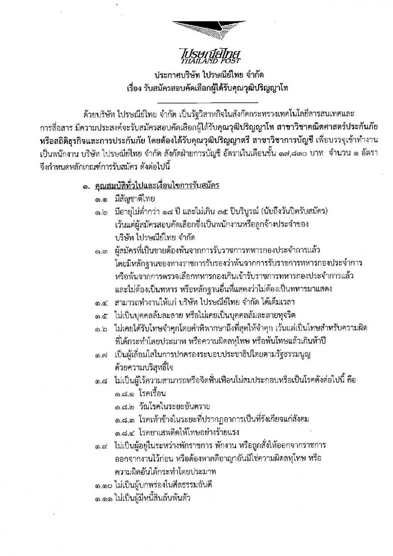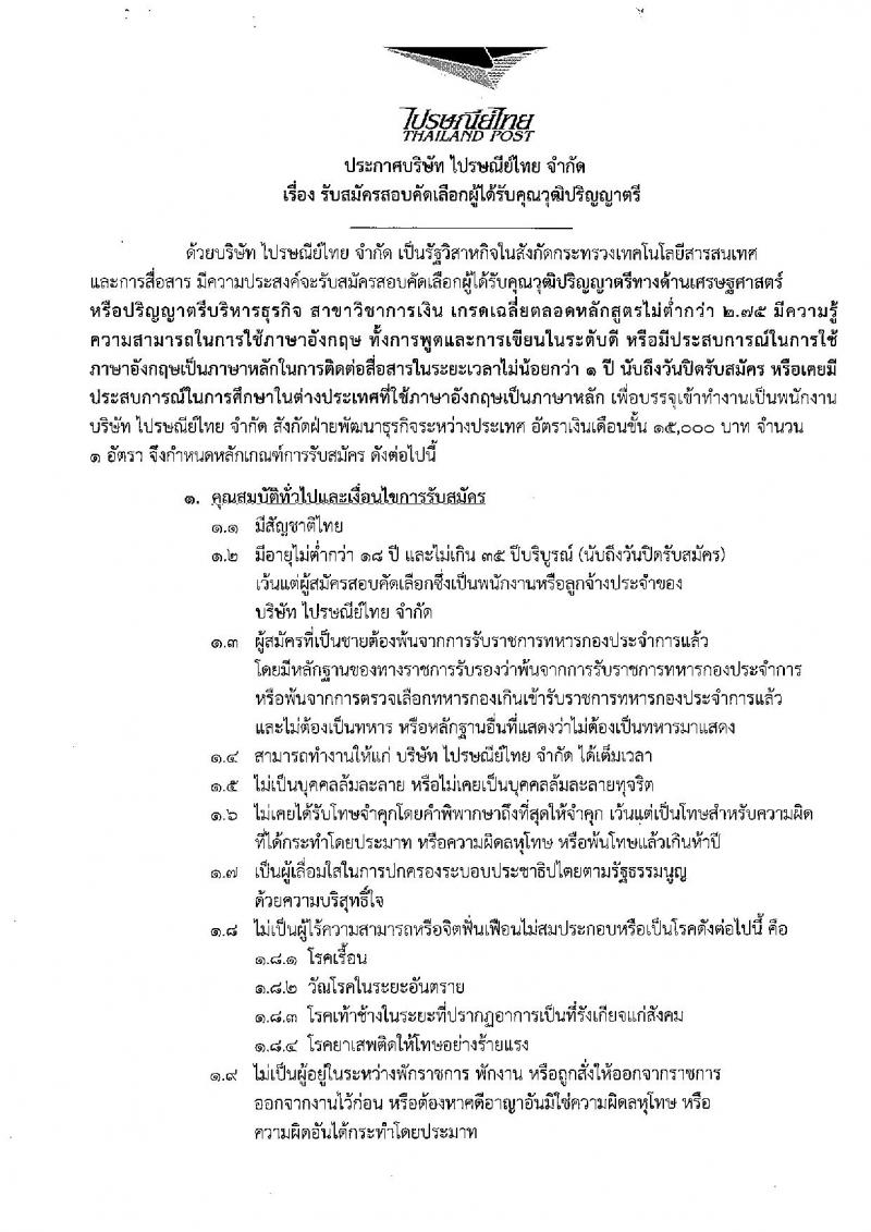 บริษัท ไปรษณีย์ จำกัด ประกาศรับสมัครบุคคลเพื่อสอบคัดเลือกเป็นพนักงาน จำนวน 5 ตำแหน่ง 6 อัตรา (วุฒิ ปวส. ป.ตรี ป.โท) รับสมัครสอบตั้งแต่วันที่ 17 พ.ค. - 14 มิ.ย. 2559