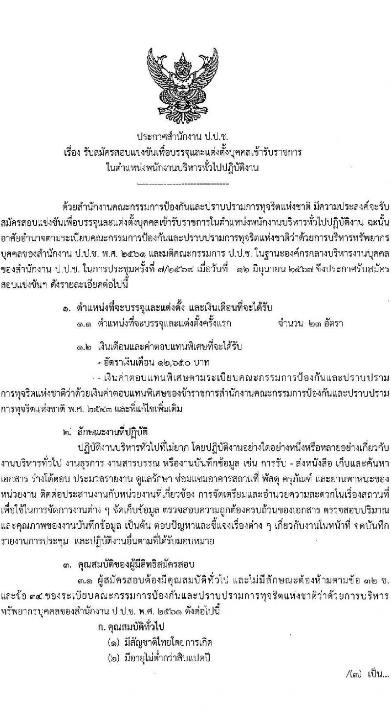 สำนักงานคณะกรรมการป้องกันและปราบปรามการทุจริตแห่งชาติ รับสมัครสอบแข่งขันเพื่อบรรจุและแต่งตั้งบุคคลเข้ารับราชการ ตำแหน่งพนักงานบริหารงานทั่วไปปฏิบัติงาน ครั้งแรก 23 อัตรา (วุฒิ ปวส.หรือเทียบเท่า) รับสมัครสอบทางอินเทอร์เน็ต ตั้งแต่วันที่ 25 มิ.ย. - 15 ก.ค. 2567