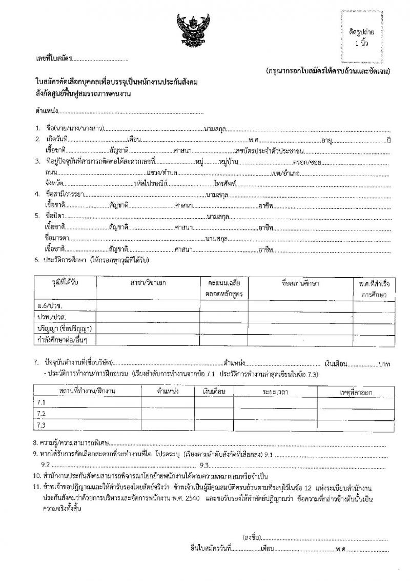 สำนักงานประกันสังคม ประกาศรับสมัครคัดเลือกบุคคลเป็นพนักงานประกันสังคม สังกัดศูนย์ฟื้นฟูสมรรถภาพคนงาน จำนวน 15 ตำแหน่ง 17 อัตรา (วุฒิ ปวช. ปวส. ป.ตรี) รับสมัครสอบตั้งแต่วันที่ 15-29 ก.ค. 2559